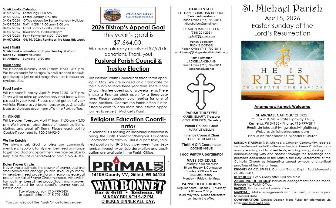 located on the Menominee Indian Reservation, is a diverse Christian community reaching out to all residents, learning, loving, sharing, and communicating with one another through the teachings and practices celebrated in the Mass & the holy sacraments of the Catholic Church by integrating sacred symbols and spiritual practices of the Menominee.
