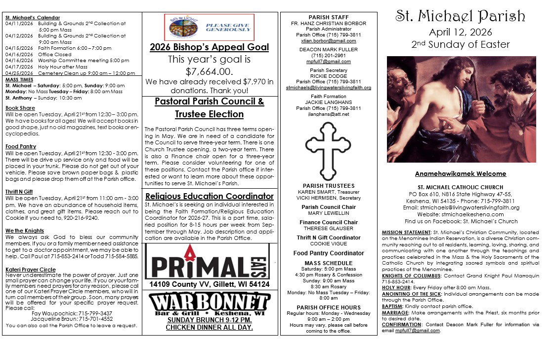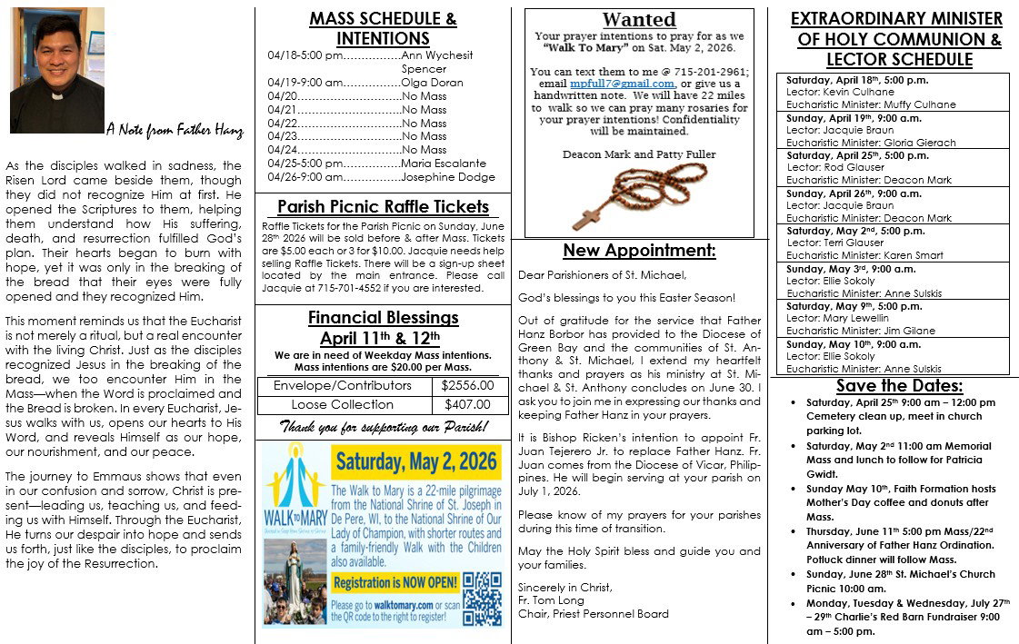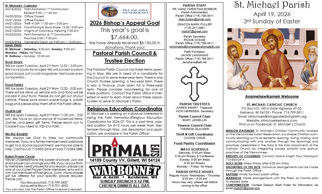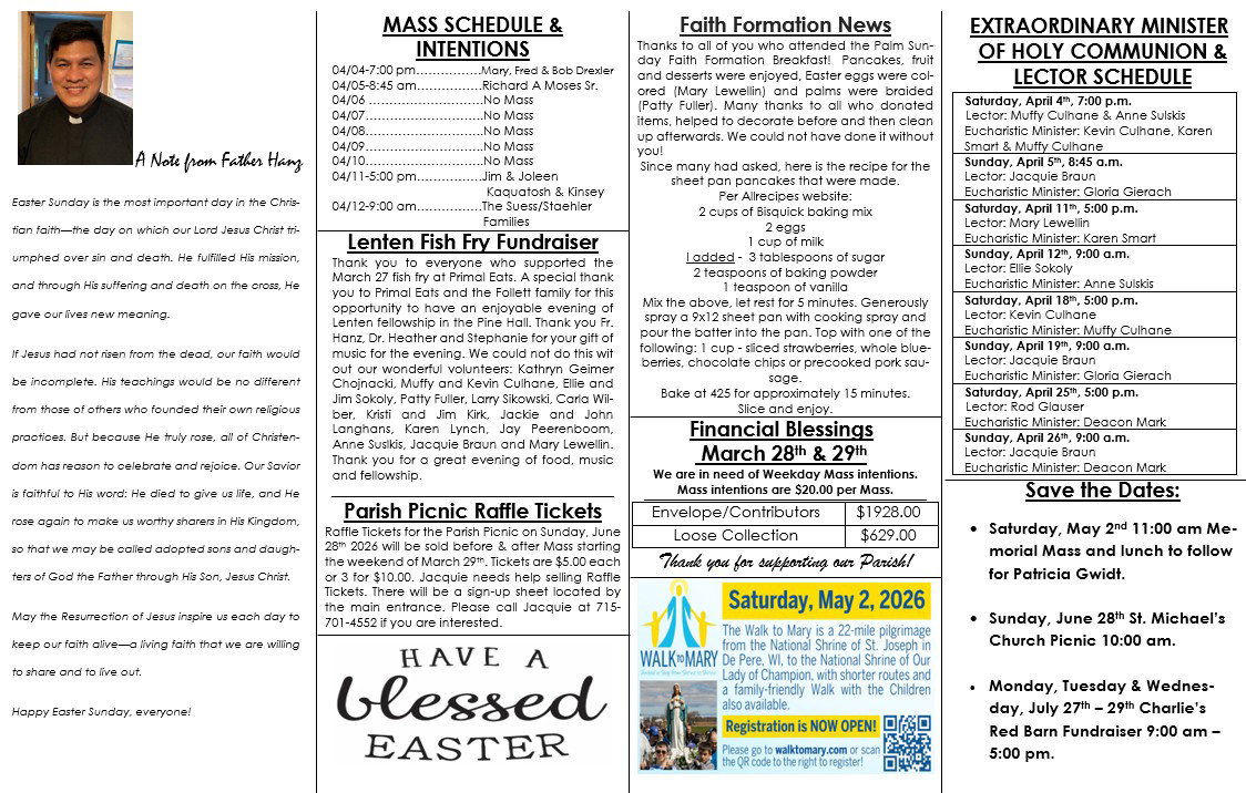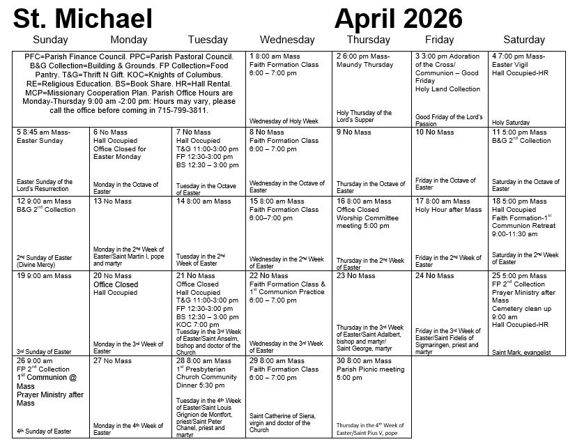 Office Hours are Monday-Thursday 8:00am-2:00pm:Please call first as hours may vary. stmichaels@livingwaters livingfaith.org 715-799-3811