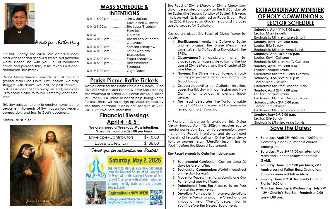 Parish office will be open from 8:15 am - 2:00 pm Monday through Thursday. Hours may vary, please call the office first. 715-799-3811